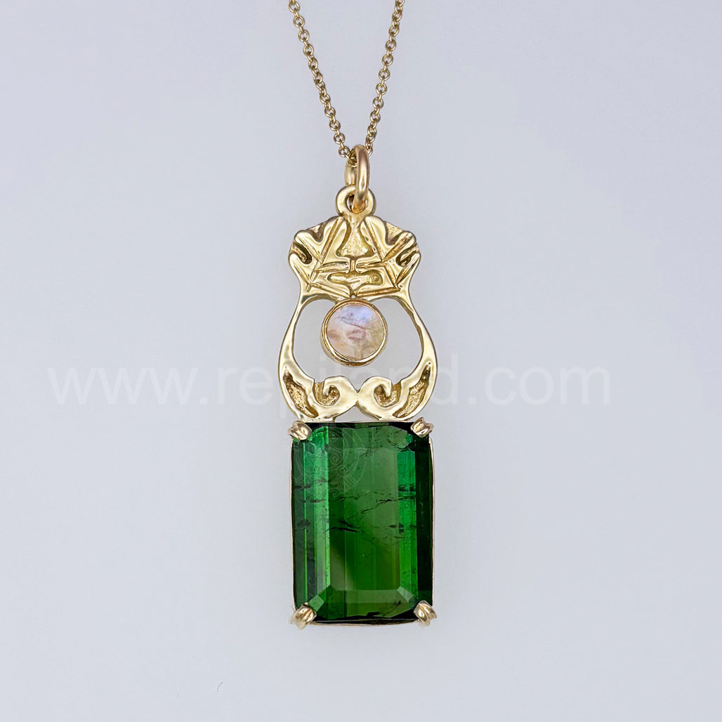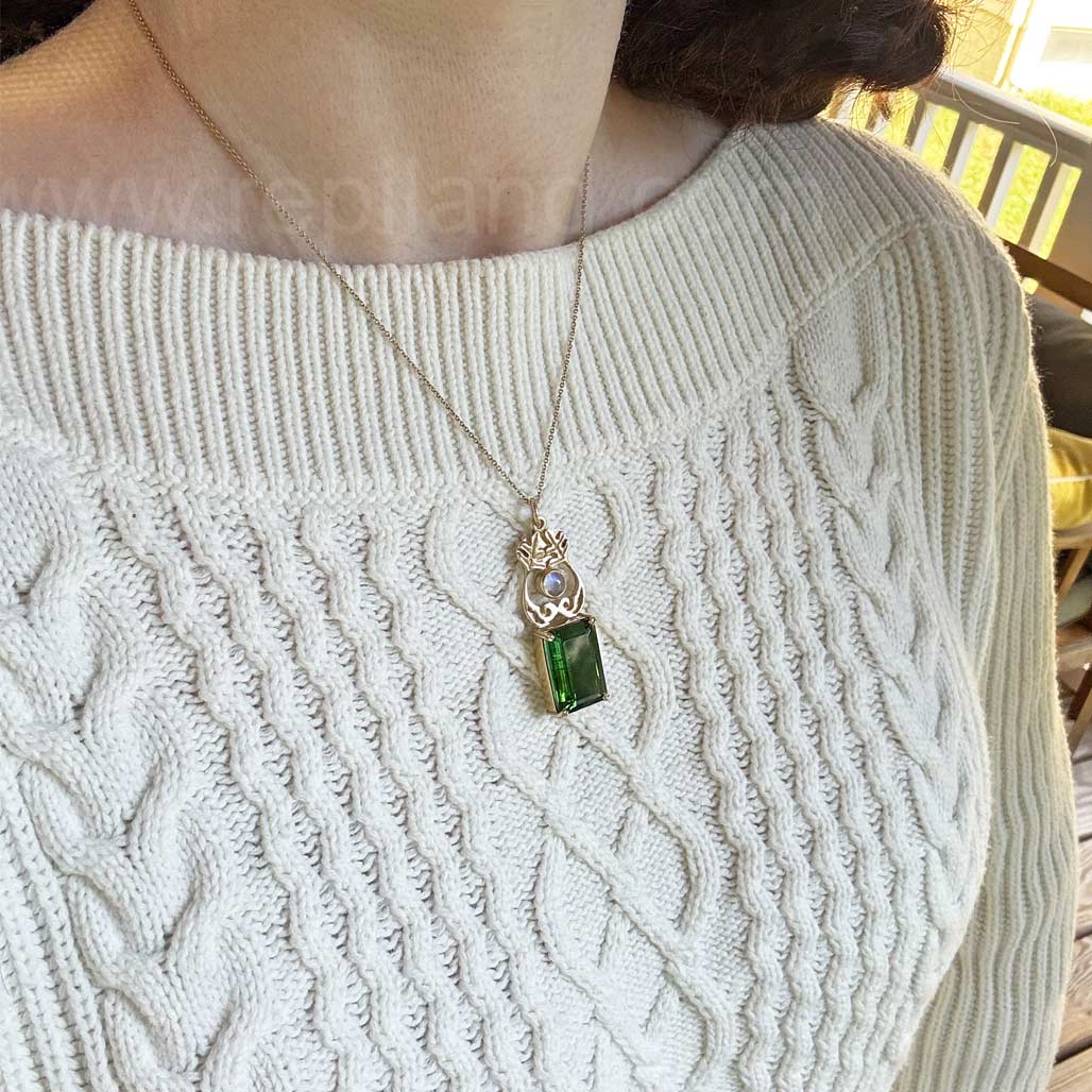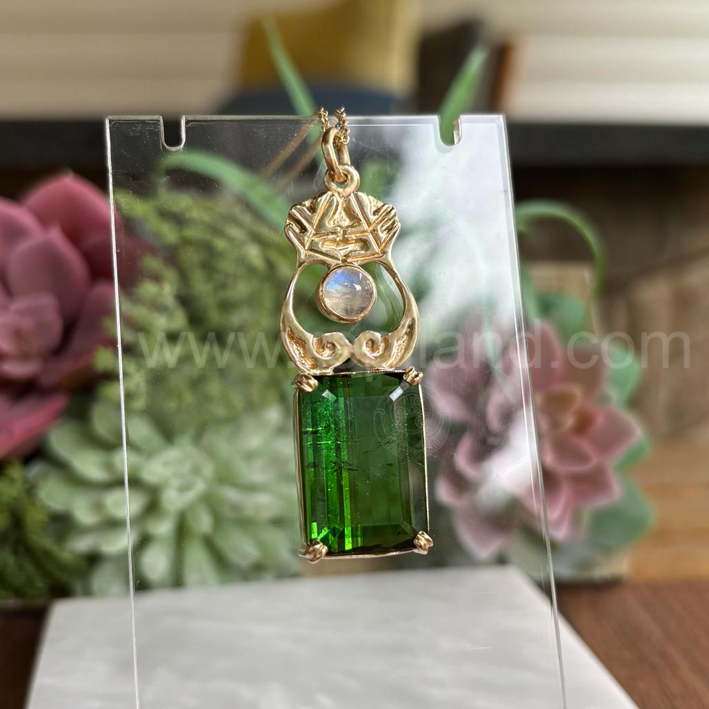 This pendant is 14kt yellow gold, composed from an Aonacht Pendant accented with a 6mm Rainbow Moonstone cabochon in a bezel at the center, below is a handbuilt basket setting holding a 20.71ct (20x14mm) emerald cut Green Tourmaline. Measures 1 7/8" x 5/8".