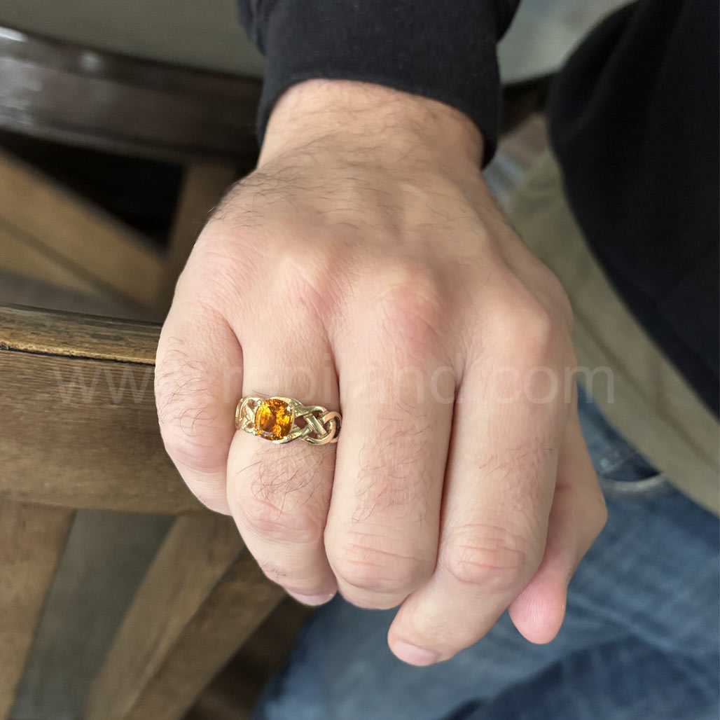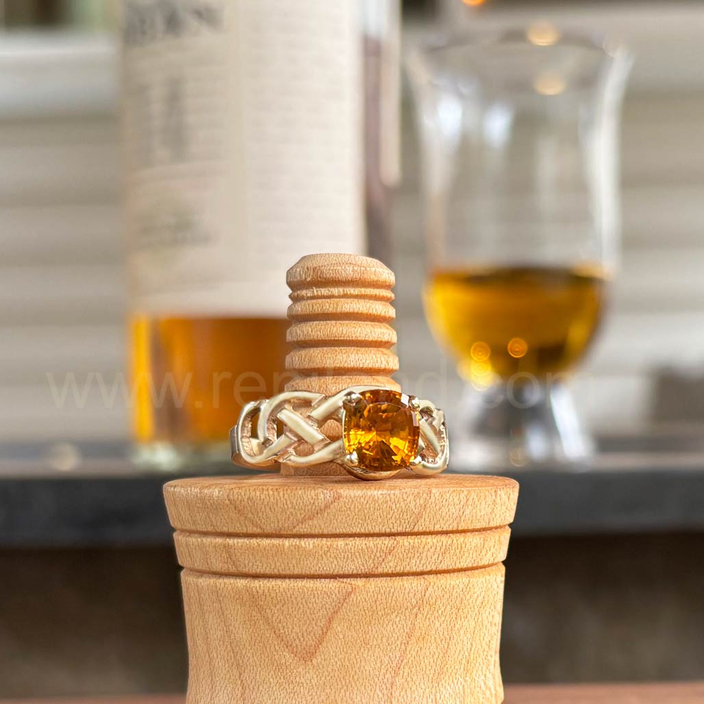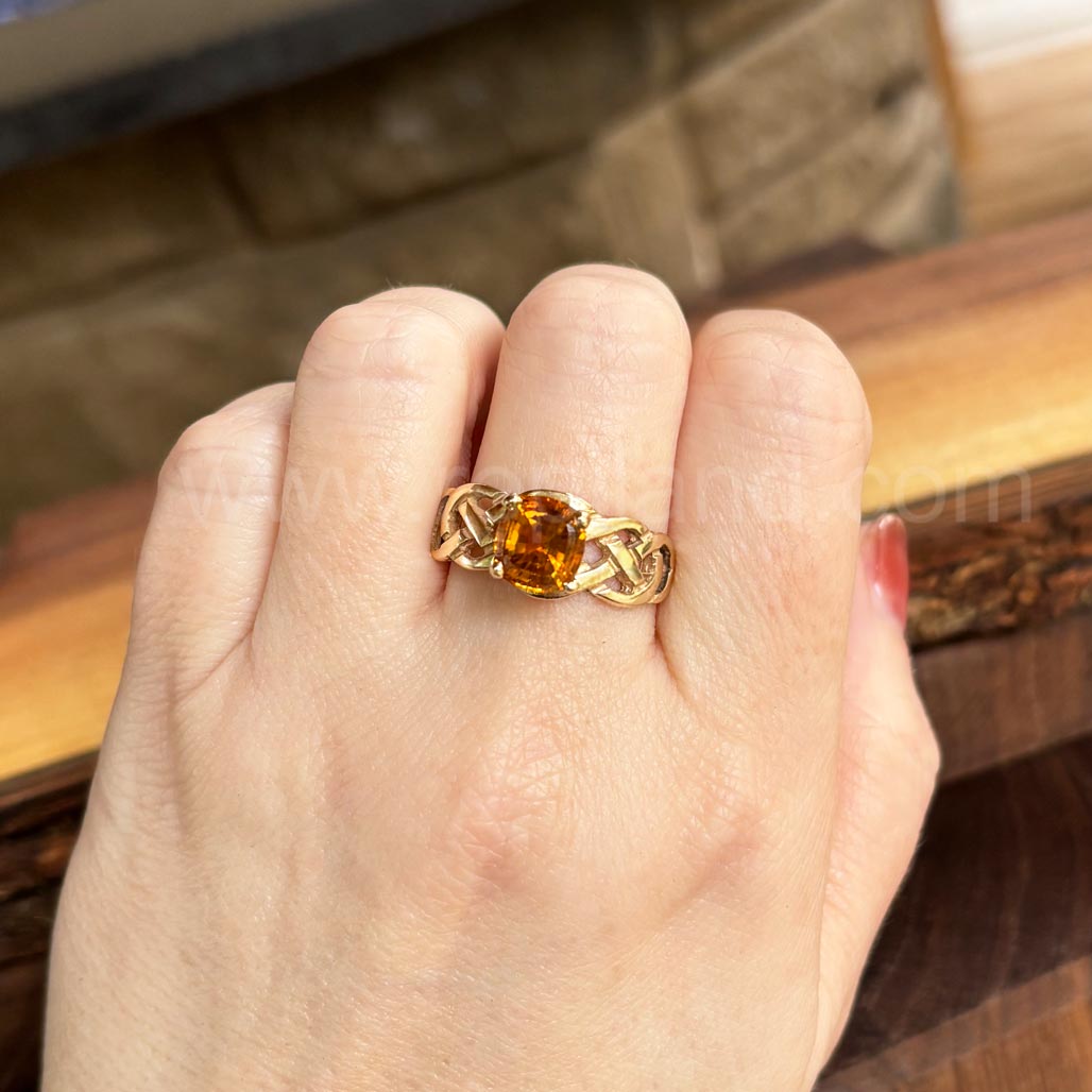 This modified Elidir ring is 14kt yellow gold with a 2.76ct 8x8.5mm cushion cut, faceted Golden Tourmaline in a basket setting. The ring measures 3/8" at the top and narrows to 1/8" at the back. The ring can be sized within the range offered above, at no additional cost, before shipping.