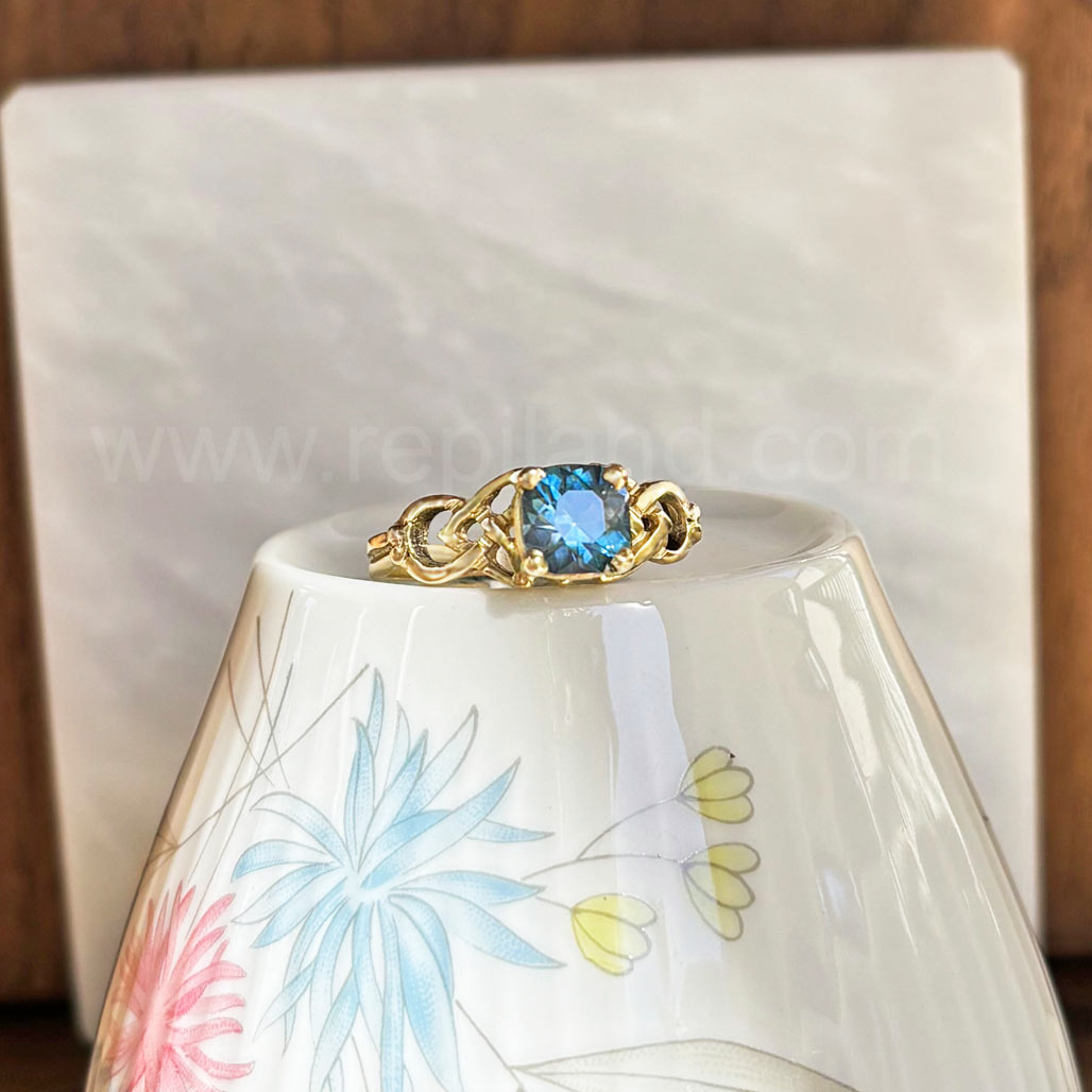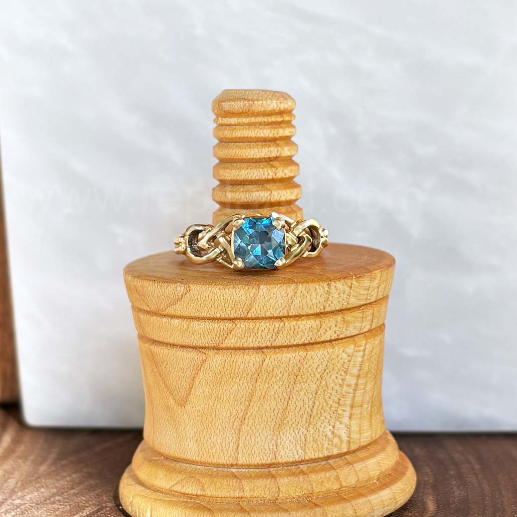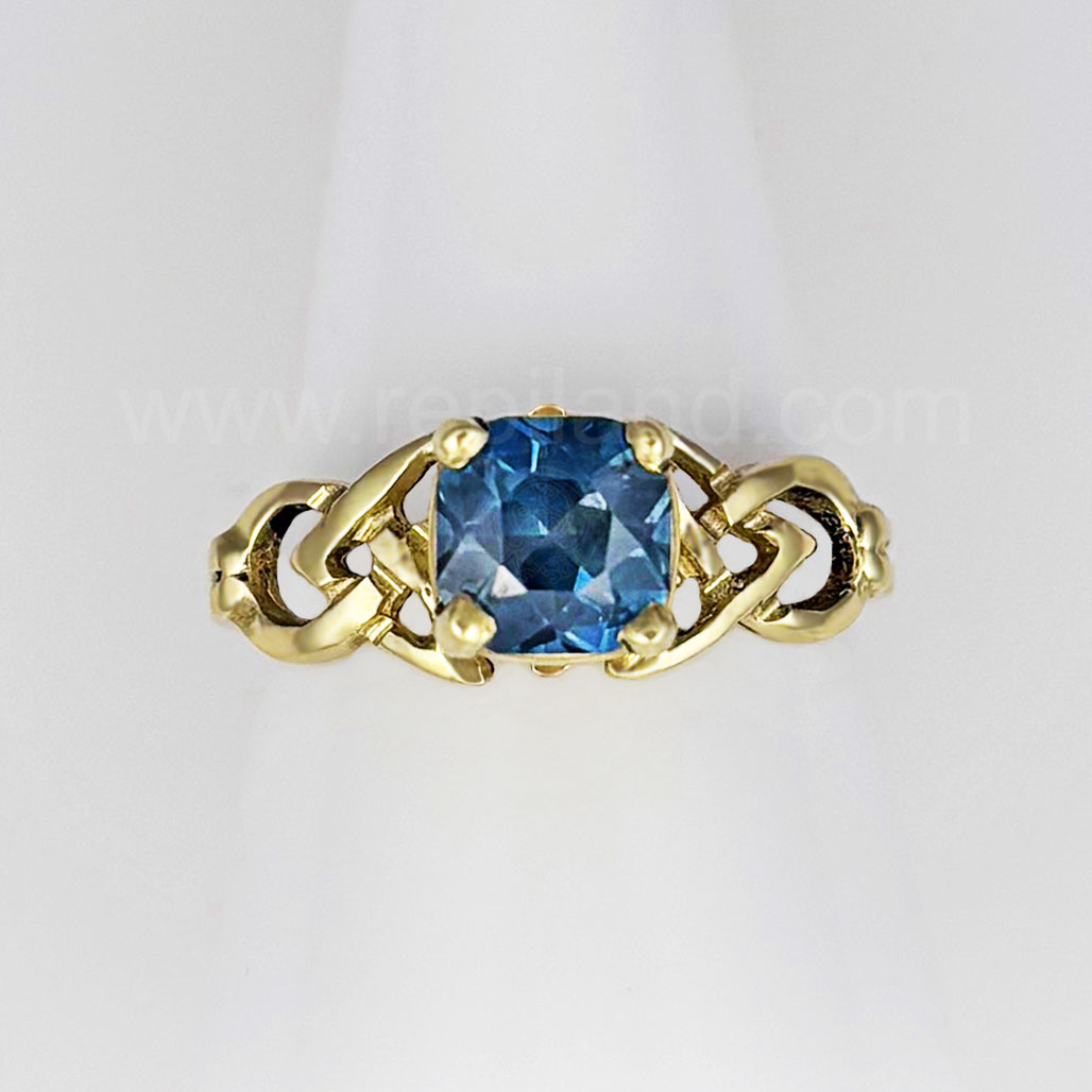 This modified 14kt yellow gold ring has pierced knotwork and a 2.17ct 7mm cushion cut, faceted Blue Zircon in a basket setting. The ring measures a little over 1/4" at the top and narrows to just under 1/8" at the back. The ring can be sized within the range offered above, at no additional cost, before shipping