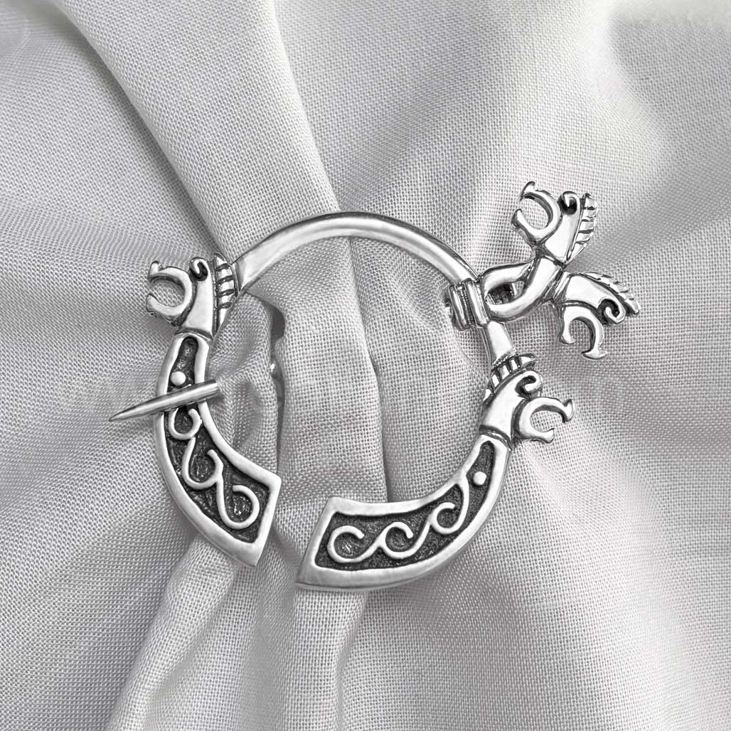 Introducing Rob's newest zoomorphic design- the Beithir Penannular. Beithir is a Scottish-Gaelic mythological serpent dragon. This penannular features a stylized serpent dragon head on each side above the curved finials (ends) that have beads and waves inside a frame. The penannular measures (without pin) 2 1/8 inches wide and 1 3/4 inches long, the pins are approximately 2 1/4-2 1/2 inches.
