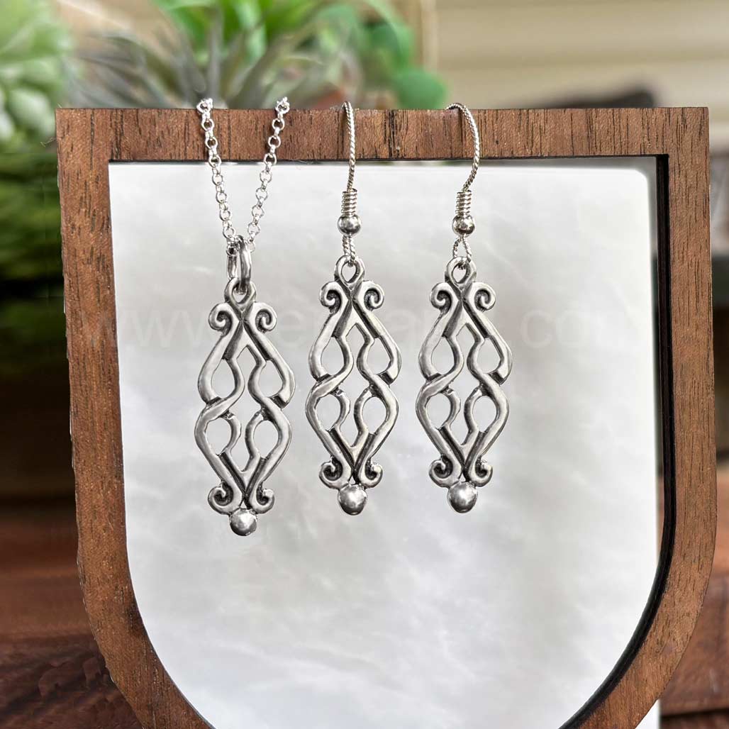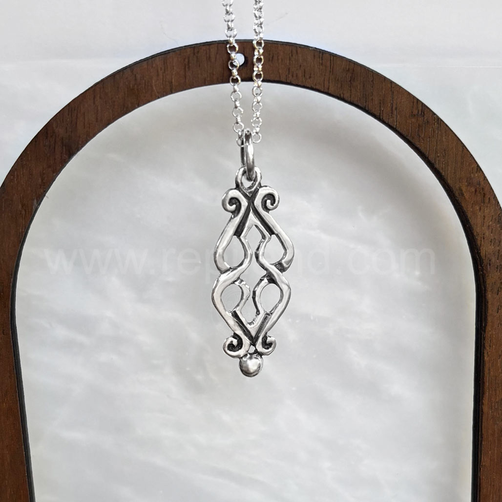 Fadó is Irish meaning long ago. It is used similarly to Once Upon a Time in storytelling. The Fadó Knot Pendant is one of those timeless pieces, it looks modern yet has a touch of ancient magic. The pendant is formed from two overlapping heart shaped pieces with curled ends and a large bead accent at the bottom.