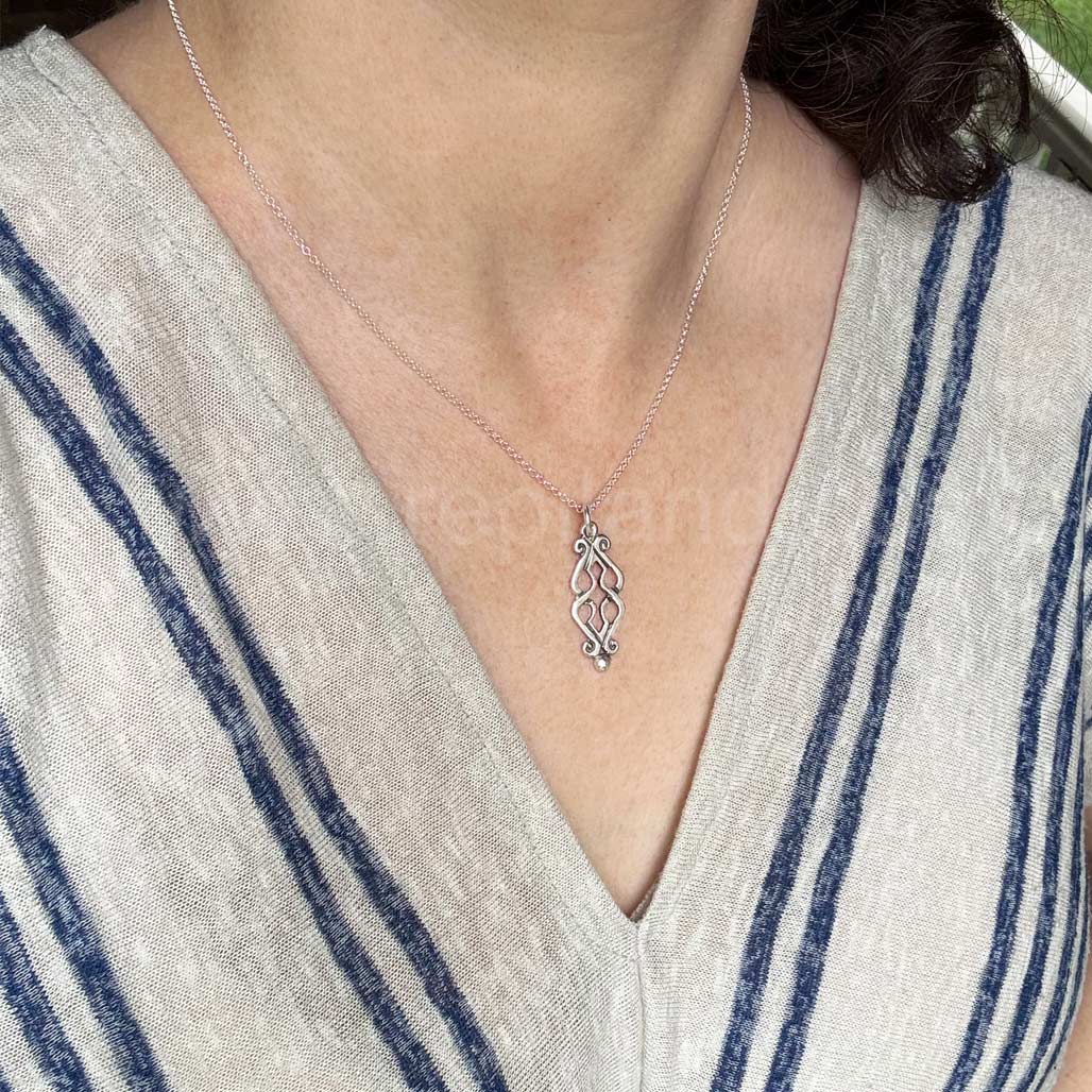 The Fadó Knot Pendant measures 1 1/4 inches long and 1/2 inch wide. An adjustable sterling silver chain is included, please see the photos above for instructions if needed. We've also included the option to switch to a heavier chain, in a variety of lengths, at no additional cost.