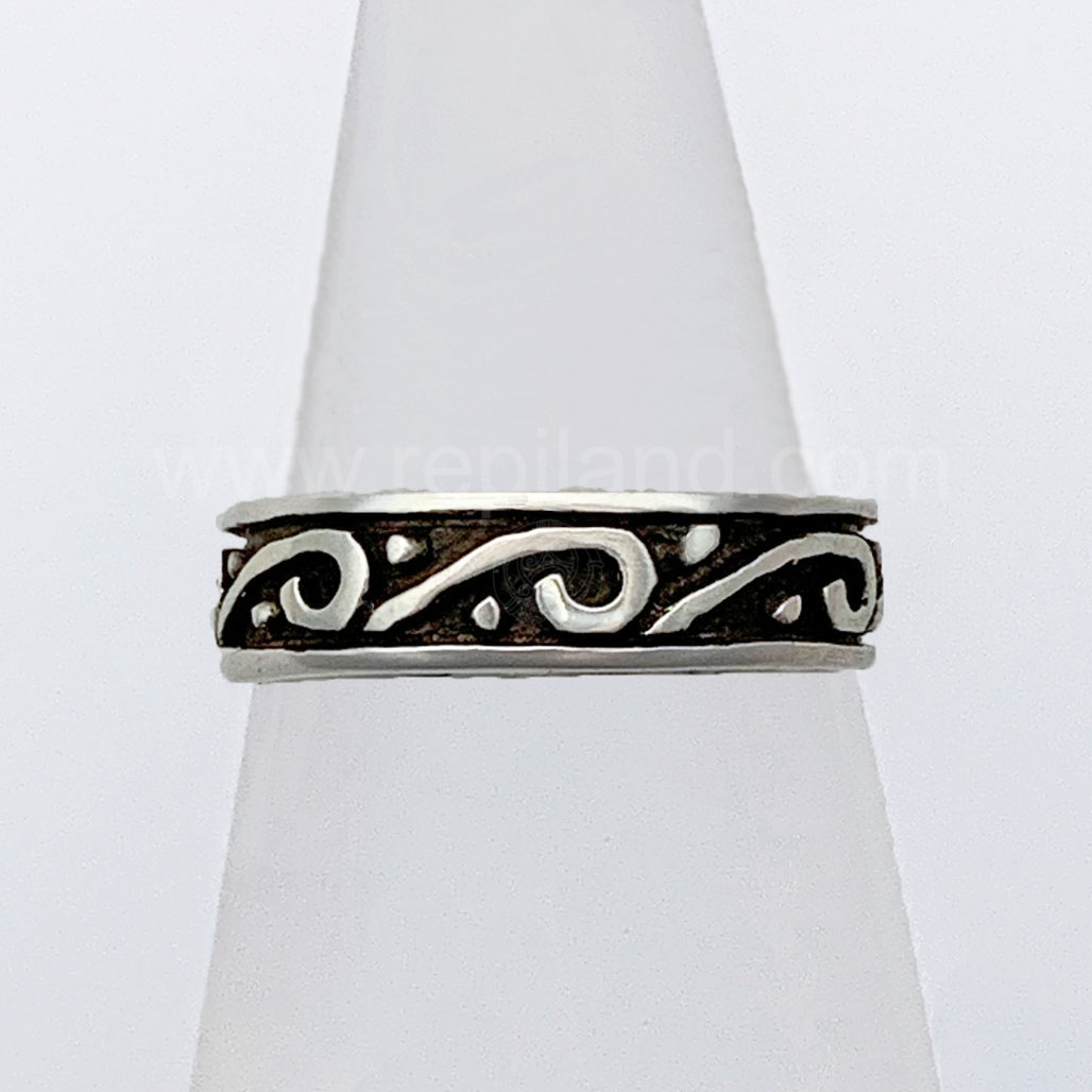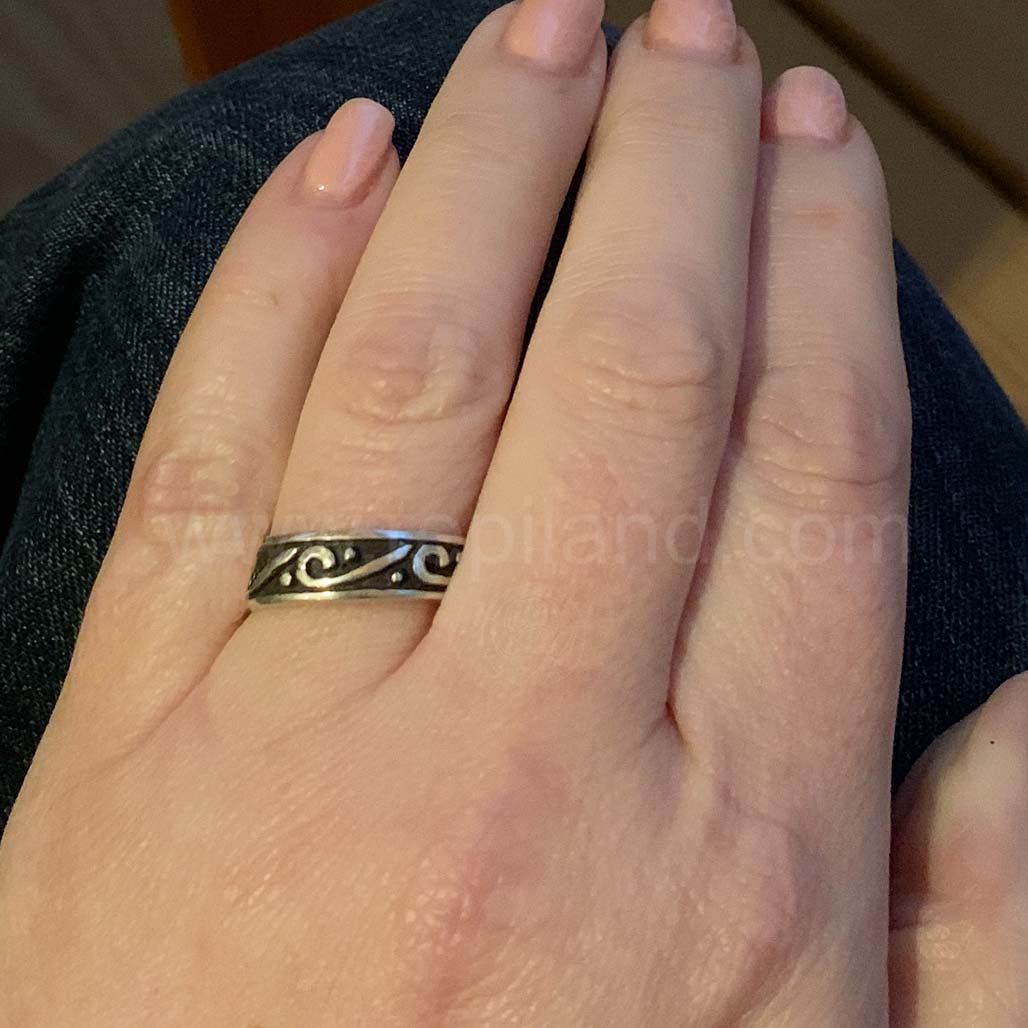 The Glenna wedding band bears scrolls and dots all the way around with an oxidized background to highlight the scrollwork and rims. The band is 6mm wide all the way around. We offer a wide version, as well.
