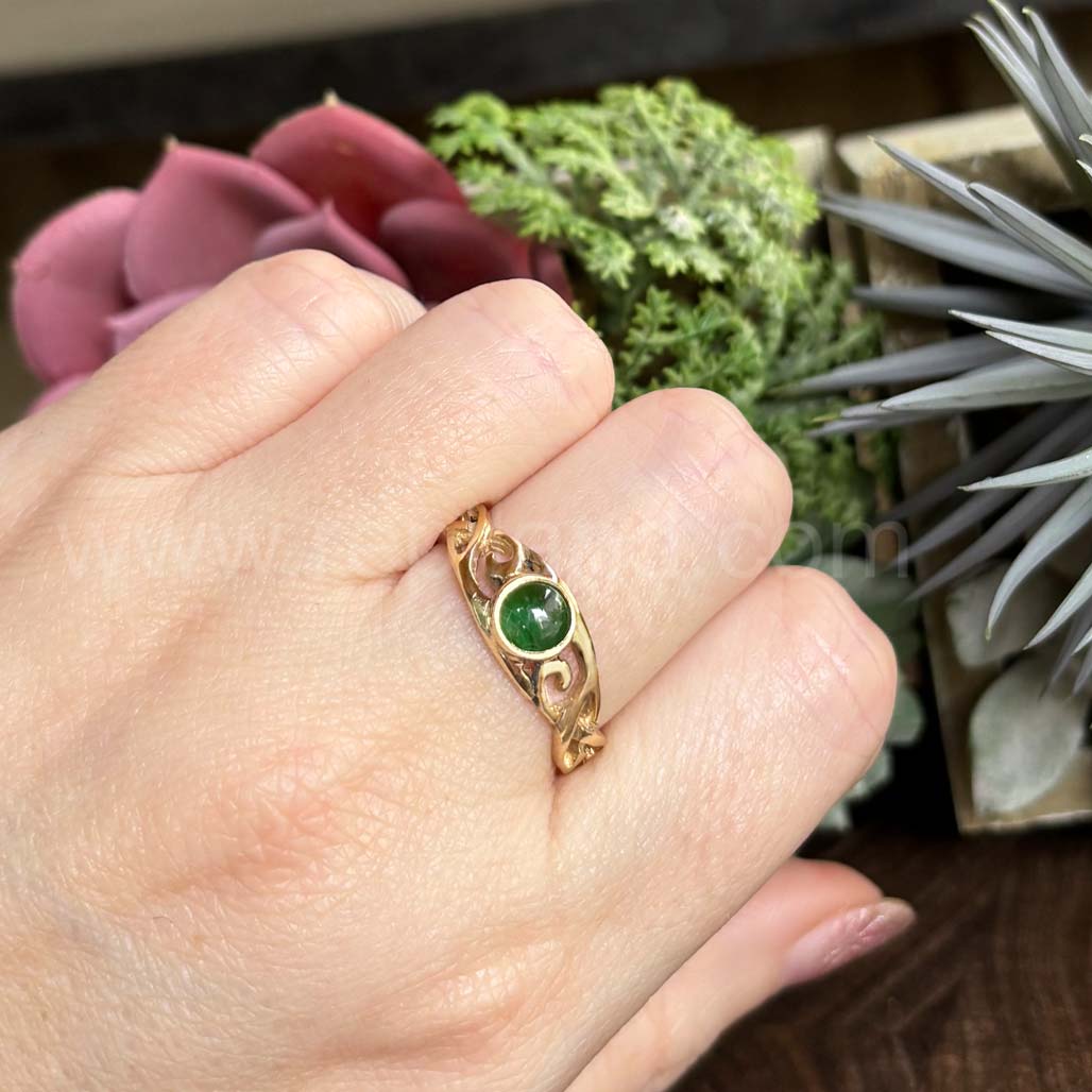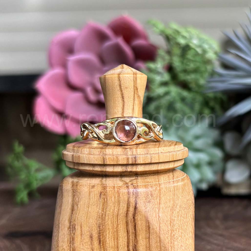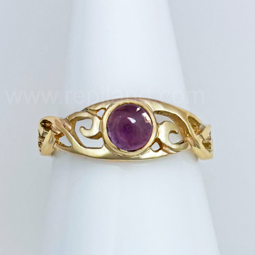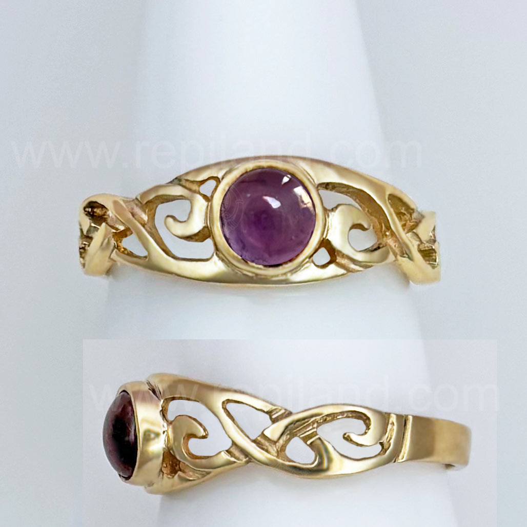 The Hawise Gem Ring has a central 6mm gem at the center top with pierced, swirling knotwork on each side. The Hawise Gem Ring measures slightly over 1/4 inch at the top and narrows to 1/8 inch at the back.