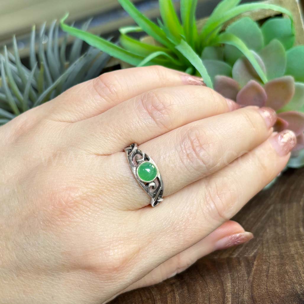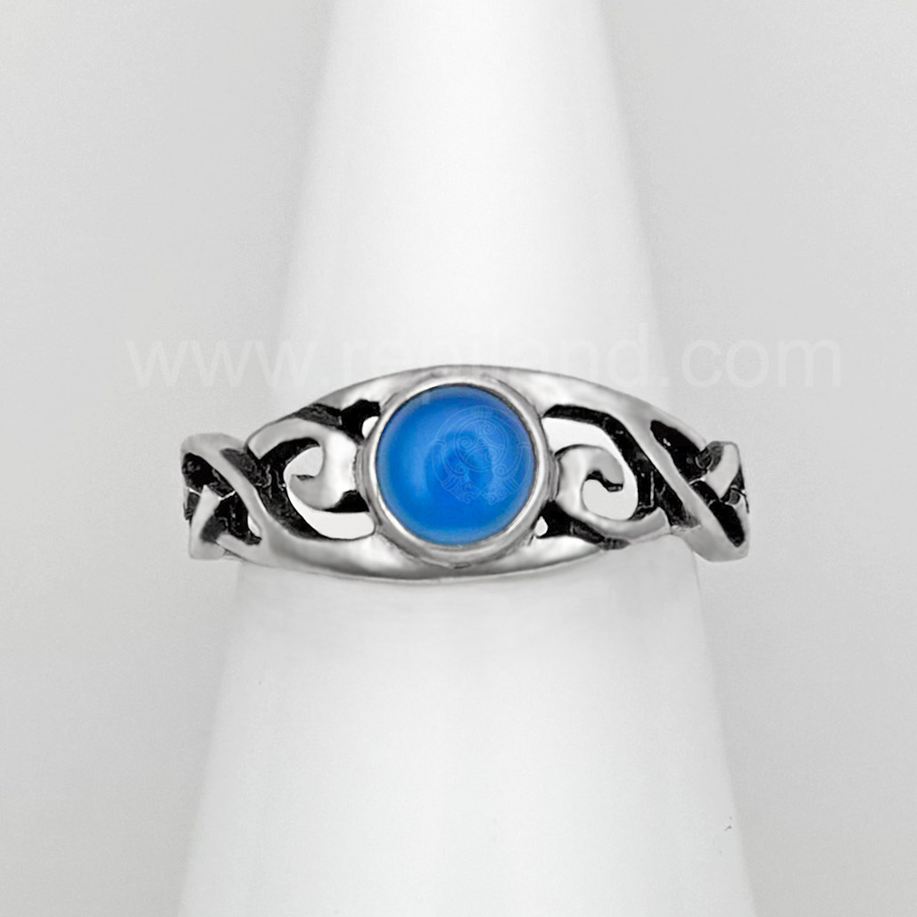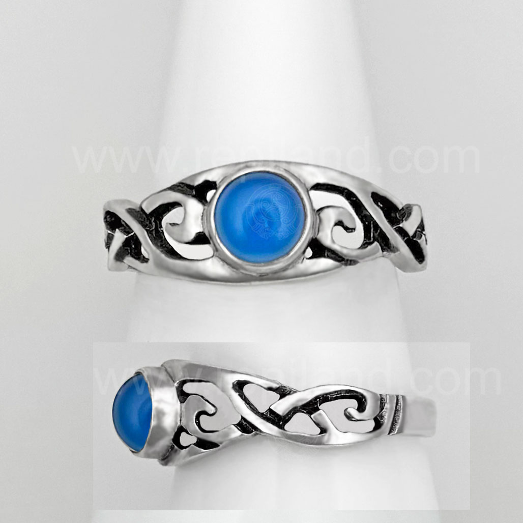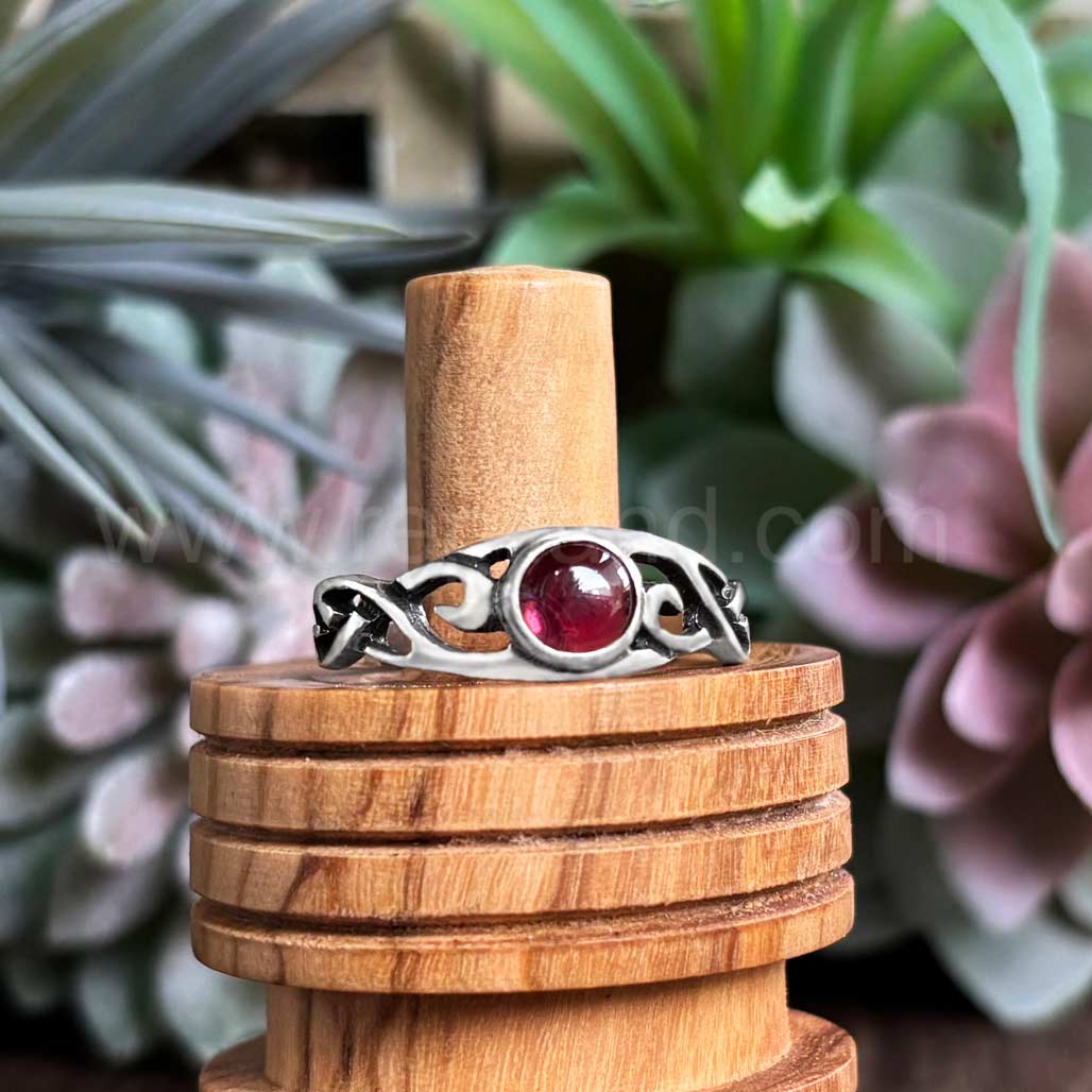 The Hawise Gem Ring has a central 6mm gem at the center top with pierced, swirling knotwork on each side. The ring measures slightly over 1/4 inch at the top and narrows to 1/8 inch at the back.