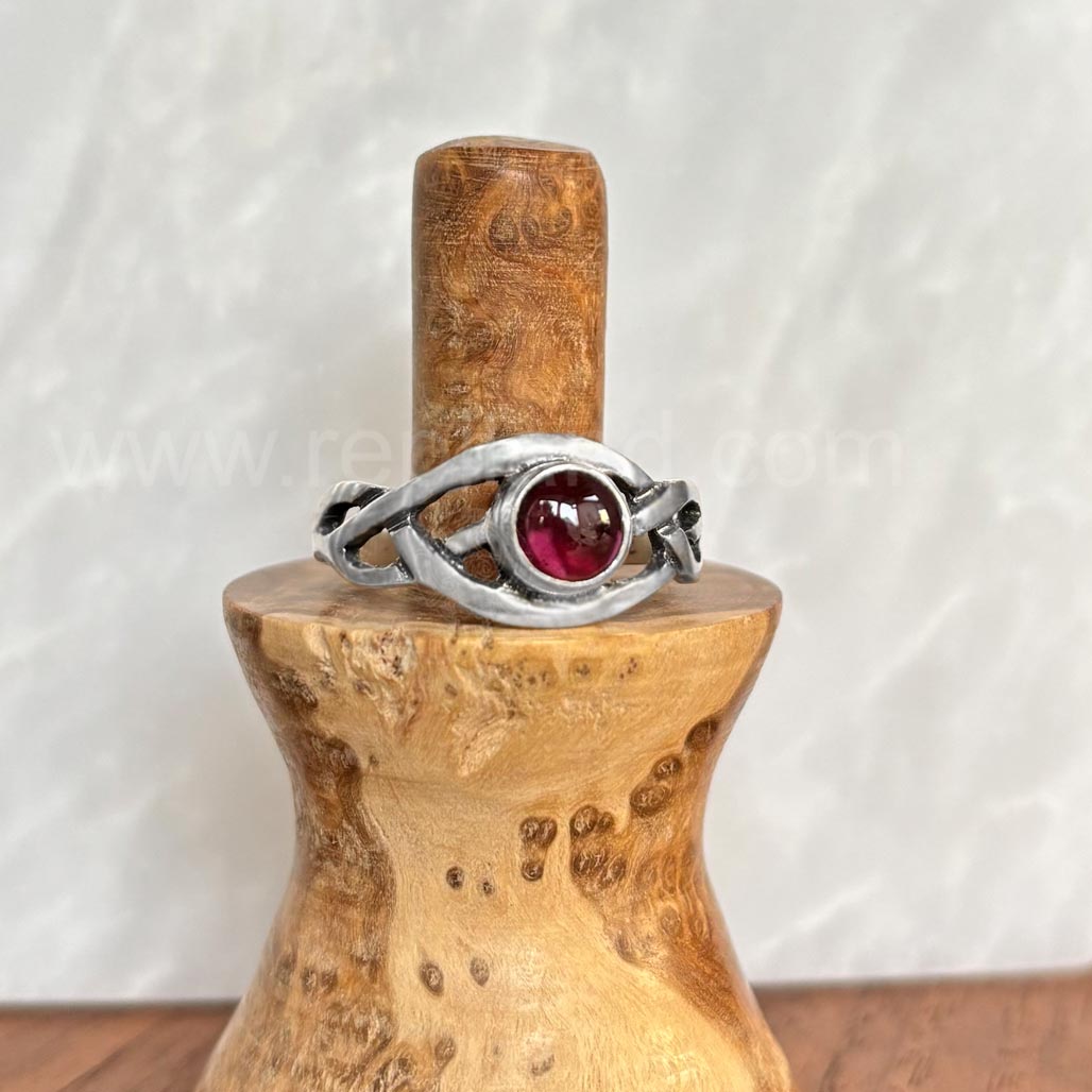 The Mwynen Gem Ring measures just under 1/2 inch at the top and tapers to about 1/8 inch at the back. It has a 6mm cabochon gemstone at the center.