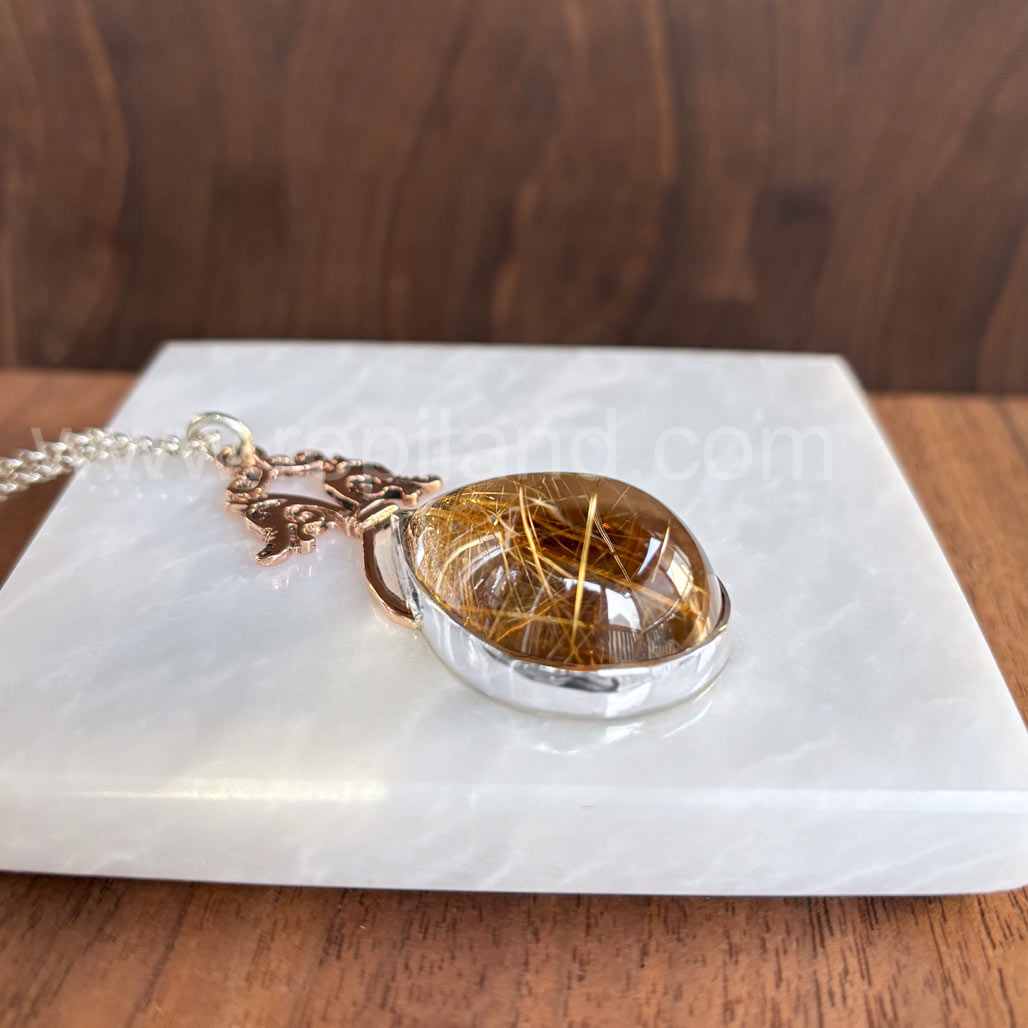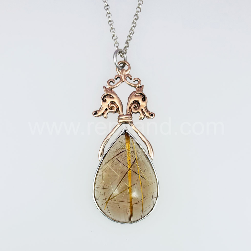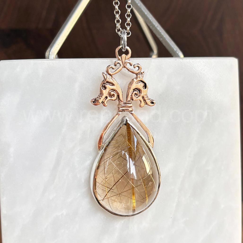 This pendant has an impressive 60ct (33x23mm) pear Smoky Rutilated Quartz cabochon. It is a translucent, warm tone, light tan with a variety of gold rutile needles overlapping and running in different directions through it. It is set in a handbuilt silver bezel beneath 14kt rose gold arches, bar details and two stylized seahorse heads that face outward. The top has gold curled pieces and a silver jump ring connects to an 18 inch heavy rolo chain. The pendant measures 2 3/8 inches long and 1 inch wide. Originally made in 2022, it is still in perfect condition. It has been thoroughly checked over, cleaned, polished and is ready to go to a new home.