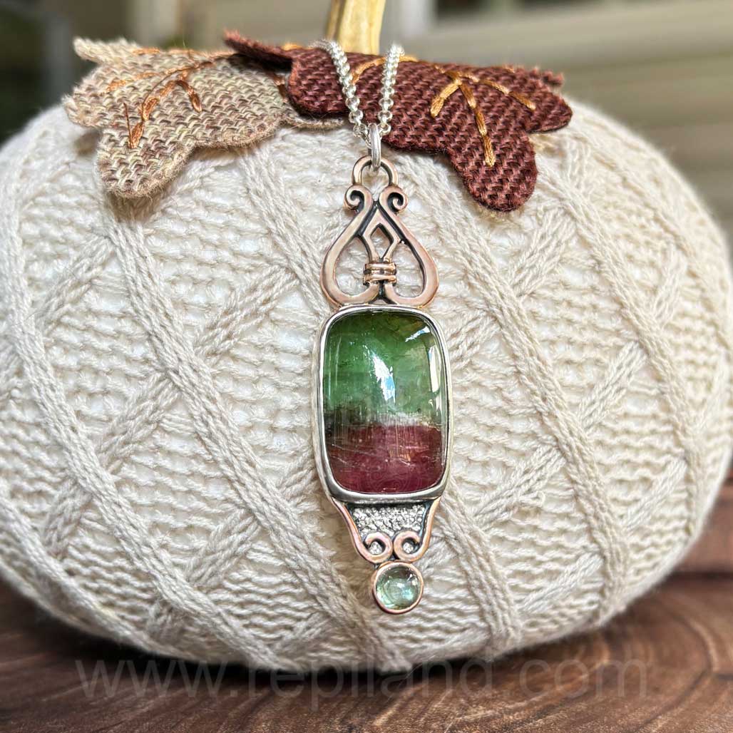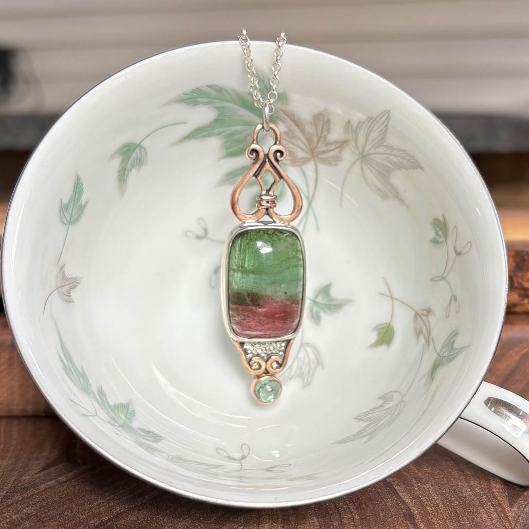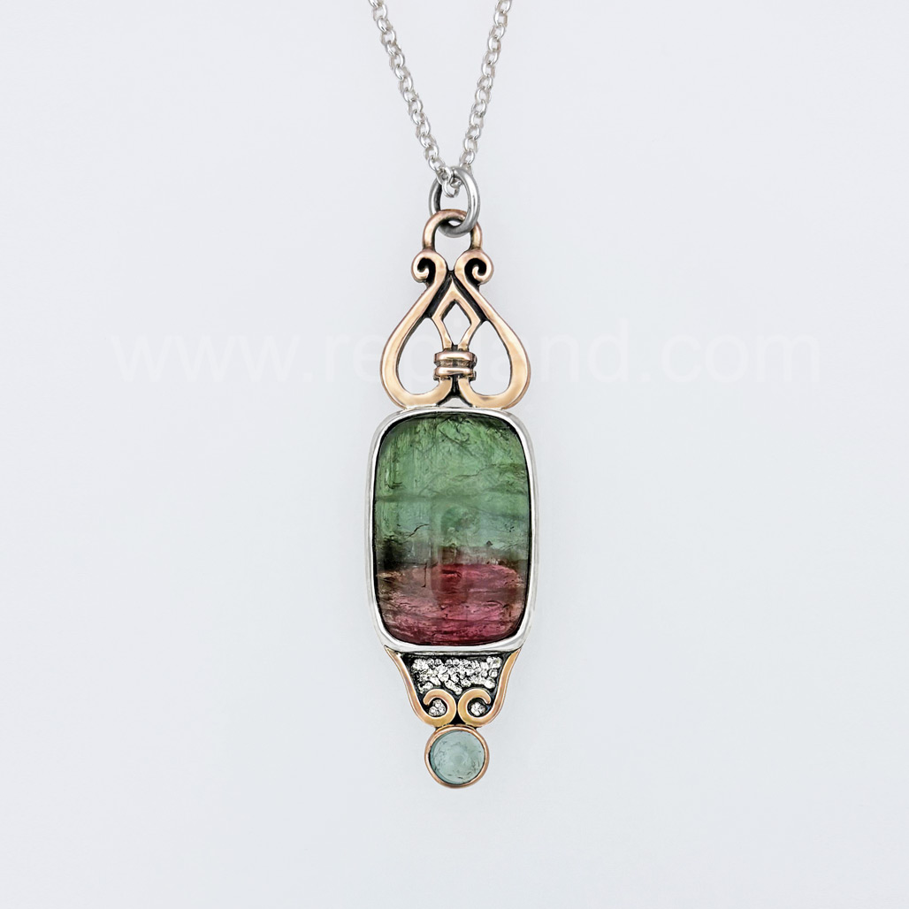 This pendant is 14kt Rose gold & sterling silver. It is composed from a gold heart shape knot (P31) above an 38.32ct (26x18mm) rectangle cushion Parti-Color Tourmaline cabochon (that goes from a medium green to a deep rose pink) in a hand built silver bezel. It is accented at the bottom with a textured silver bib with gold curls and a 6mm Light Green Tourmaline cabochon in a gold bezel. The top is gold and a silver jump ring connects to an 18" sterling chain. Measures 2 1/2" x 3/4".