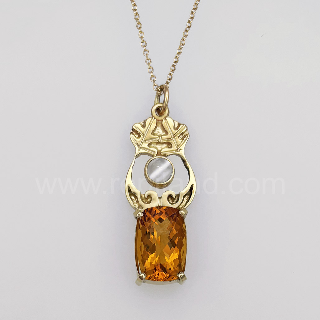 This modified pendant is 14kt yellow gold, Rob took the Aonacht Pendant and added an 11.06ct (11x17mm) checkerboard faceted, cushion cut Citrine in a basket setting at the bottom and accented it with a 6mm Cat Eye White Moonstone. The Pendant measures 1 5/8 inches long and 5/8 inch wide. An 18" 14kt yellow cable chain is included.