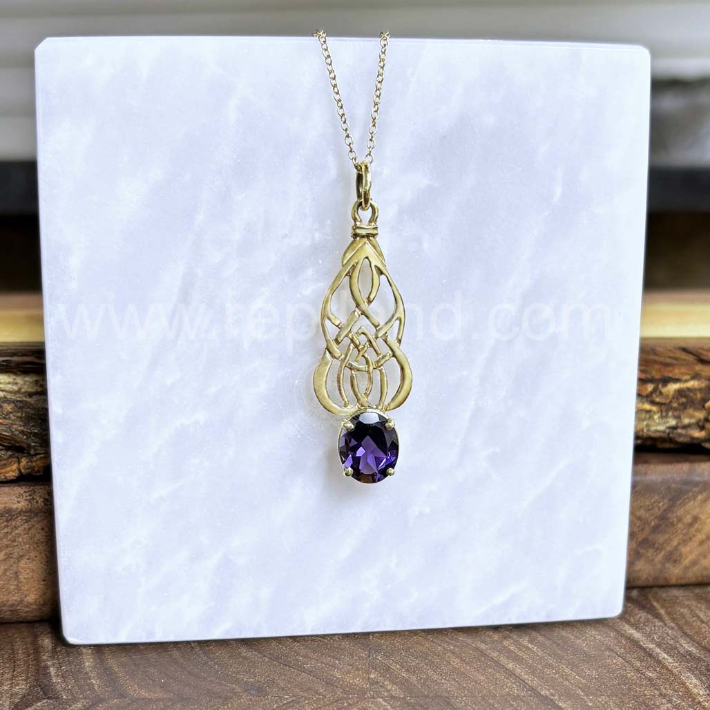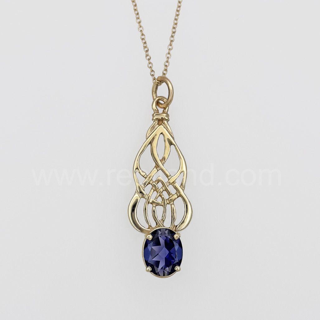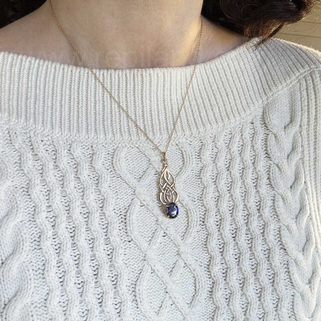 This 14kt yellow gold Blàth knot pendant has a gorgeous deep violet-blue faceted, 3.06ct (9x11mm) oval Iolite in a basket setting at the bottom. It measures 1 5/8 inches long and 5/8 inch wide. An 18" 14kt yellow cable chain is included.